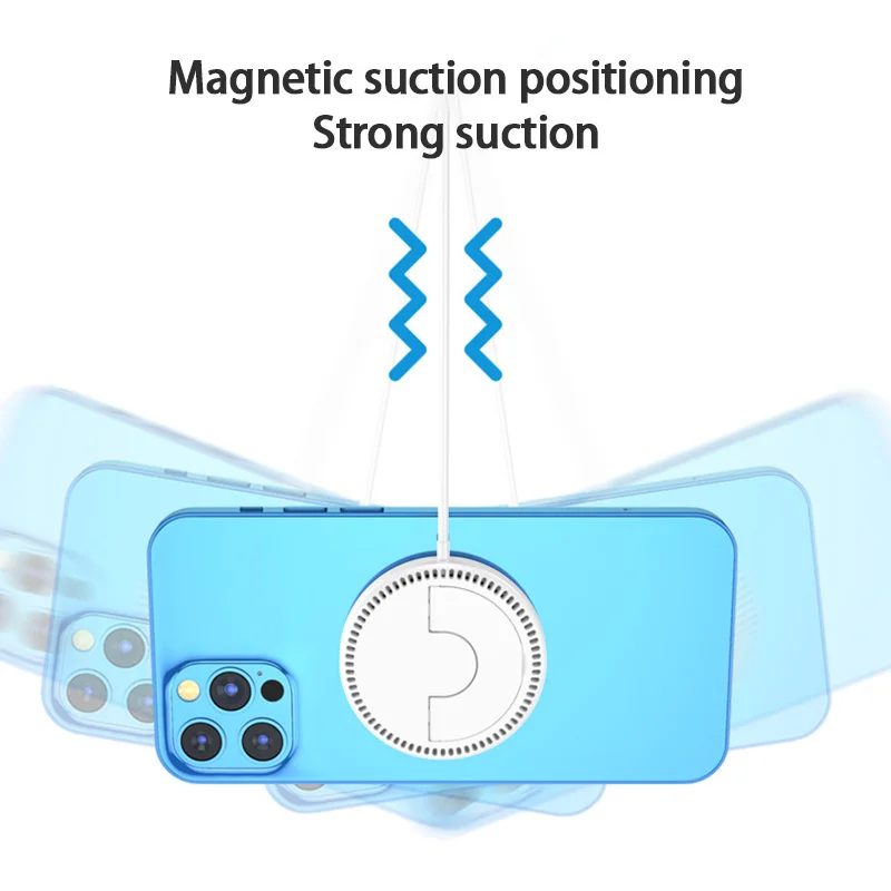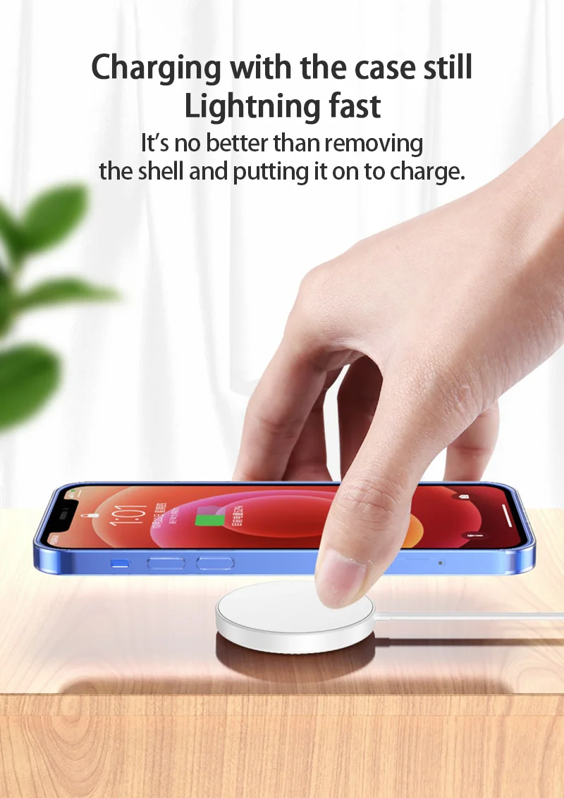El cargador inalámbrico magnético protege tu dispositivo de la sobrecarga, sobrecorriente, sobretensión, sobrecalentamiento y cortocircuitos. Te proporciona una experiencia de carga mejor y más segura (Nota: No coloques objetos extraños metálicos en la parte posterior de la funda del teléfono).