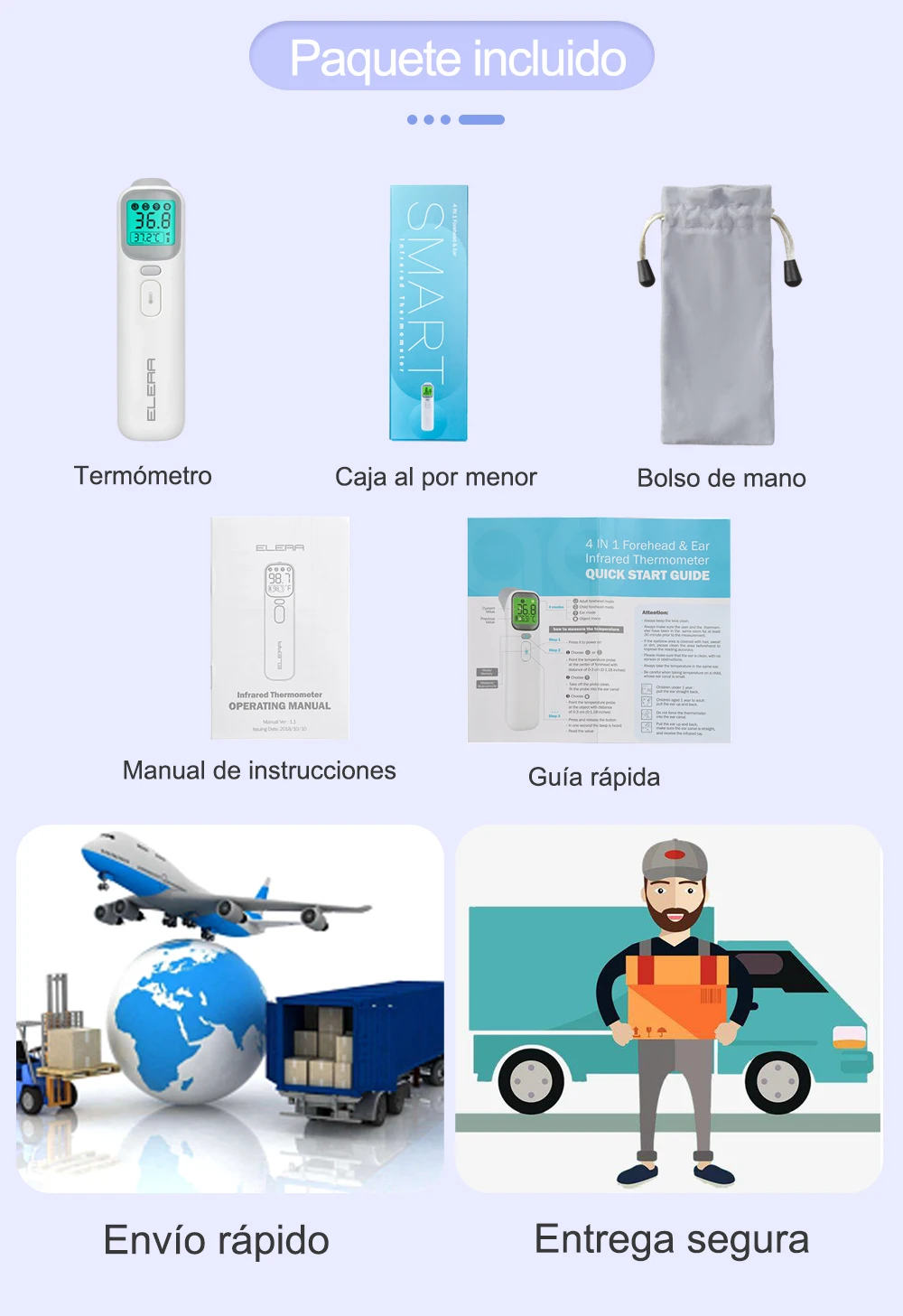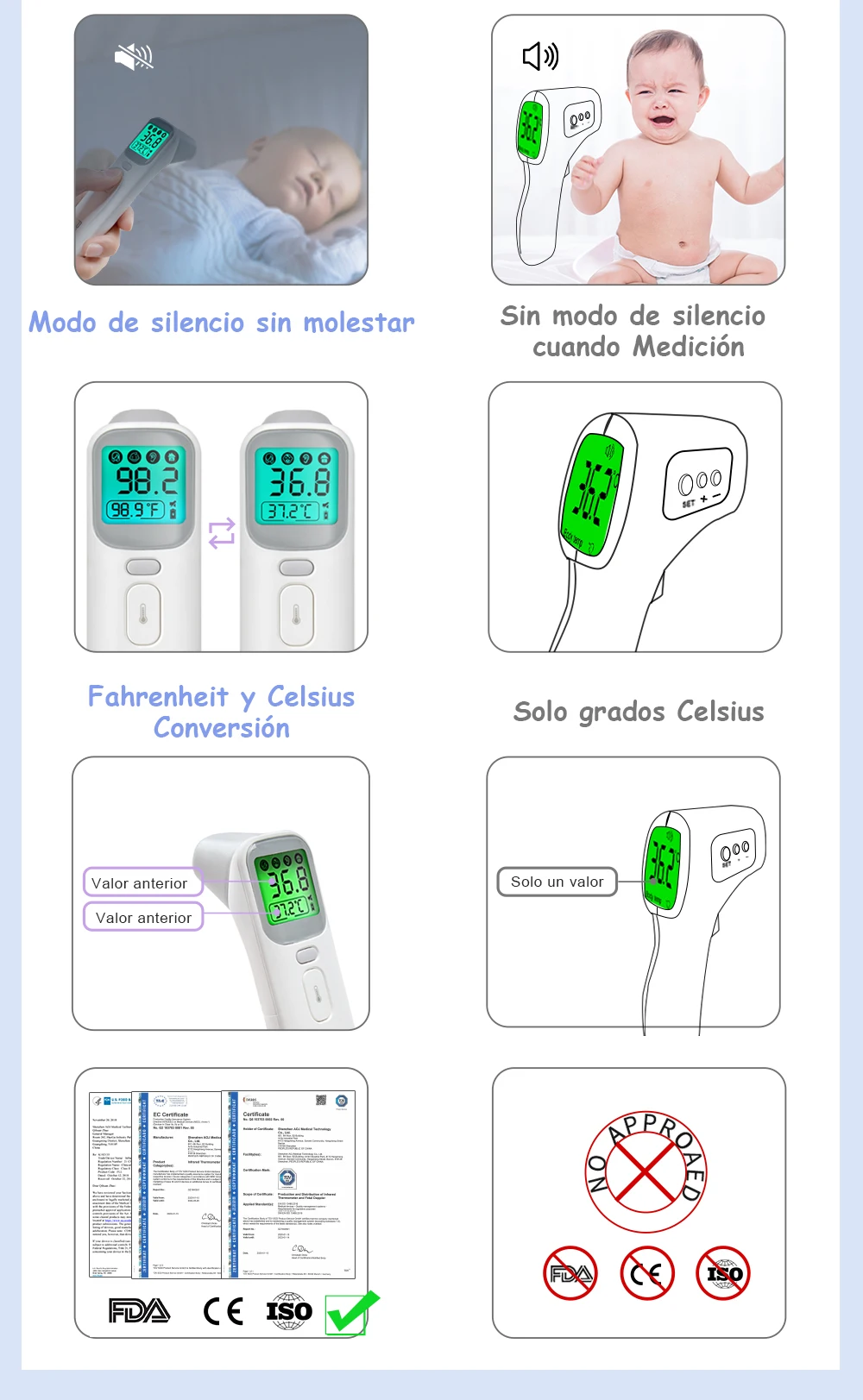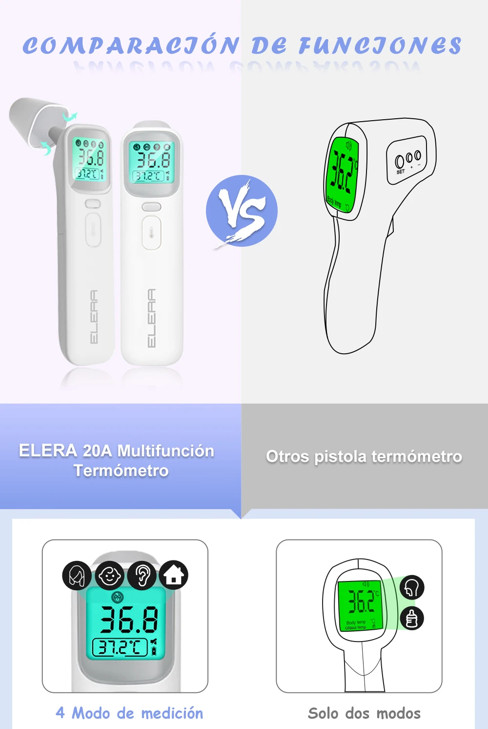 -Multifuncional; puede medir la temperatura del oído, la frente, la habitación, la leche, el agua y los objetos
