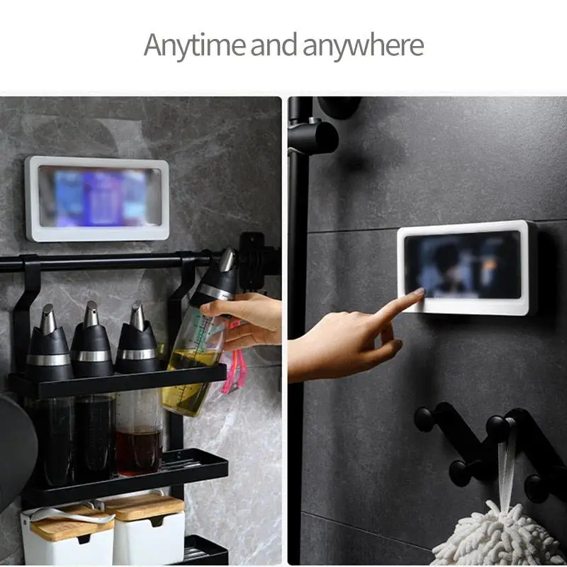Esta caja de almacenamiento viene con características completamente impermeables y a prueba de niebla con estilo montado en la pared, lo que te permite ver vídeos o escuchar música mientras te bañas o haces algo más sin preocuparte por la nebulización del agua difuminando la pantalla del teléfono y sin sujetar tu teléfono con tus propias manos, muy práctico y útil para su uso diario.